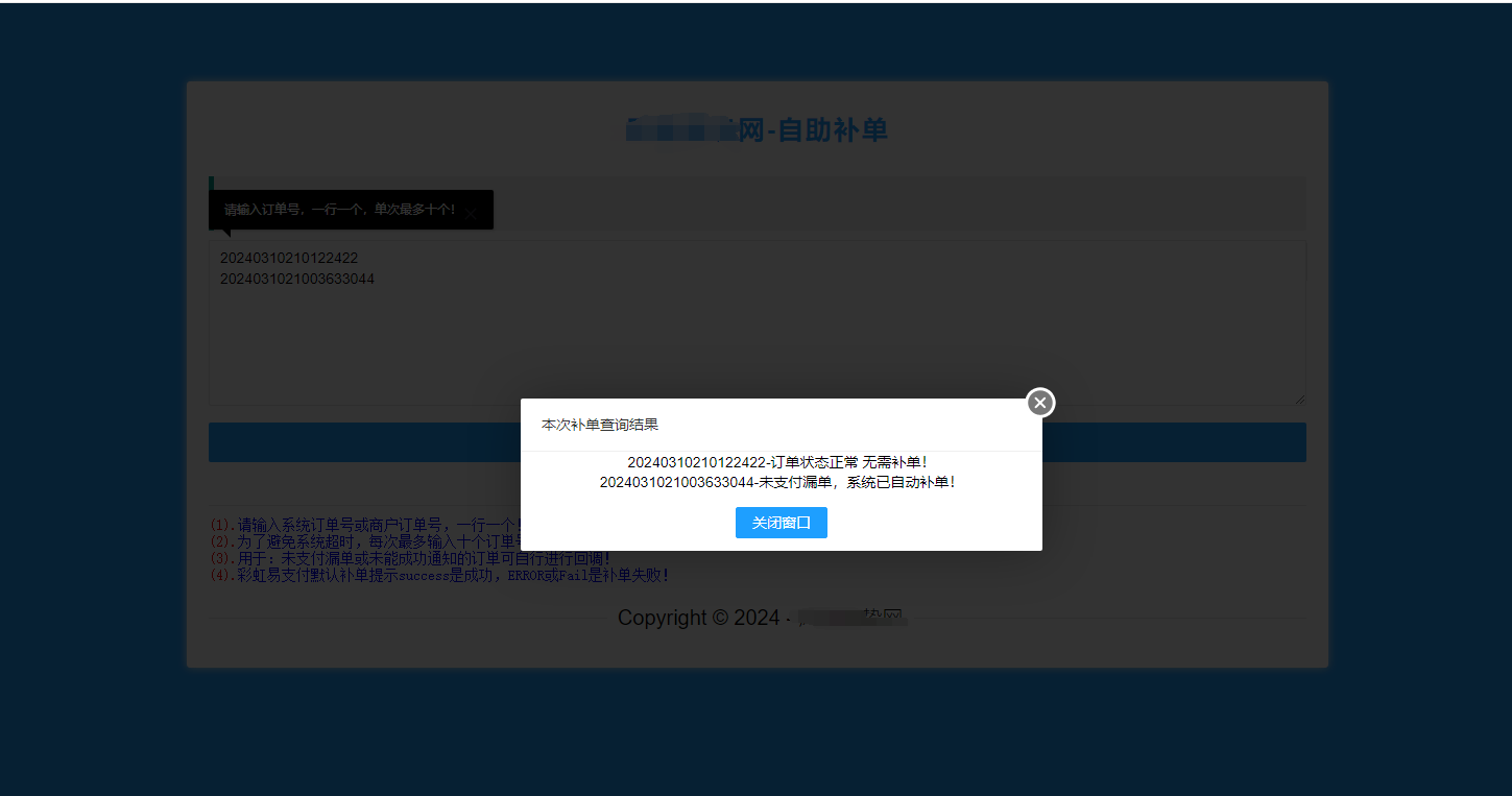 原理①:用户提交订单号,然后自动对上游易支付订单状态进行比对,若上游订单是支付成功,而他网站订单是未支付(漏单),则进行自动补单!