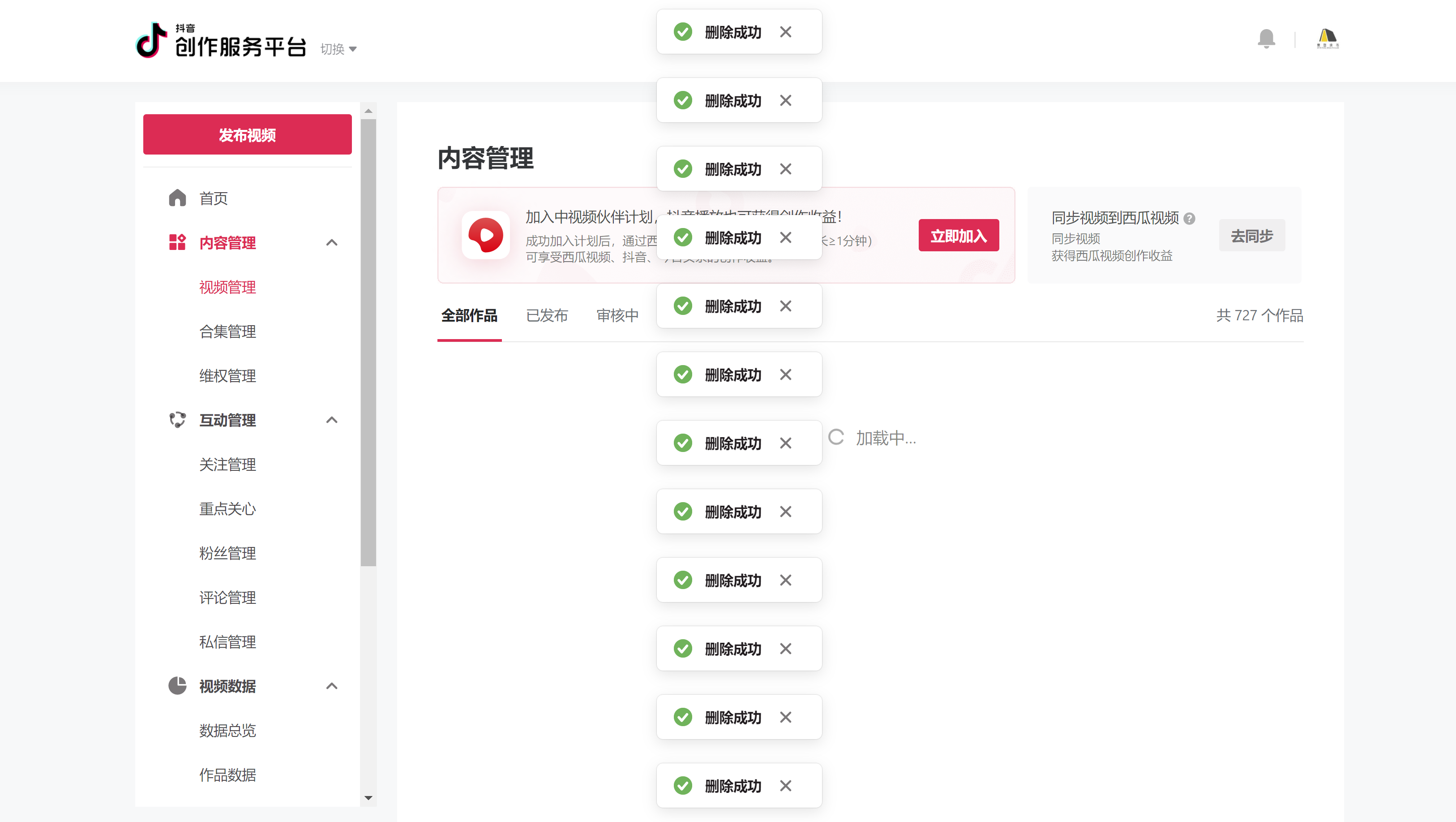 打开抖音创作者平台 https://creator.douyin.com/creator-micro/content/manage ,点开视频管理,在浏览器开发者控制台输入以下代码即可全自动删除作品。