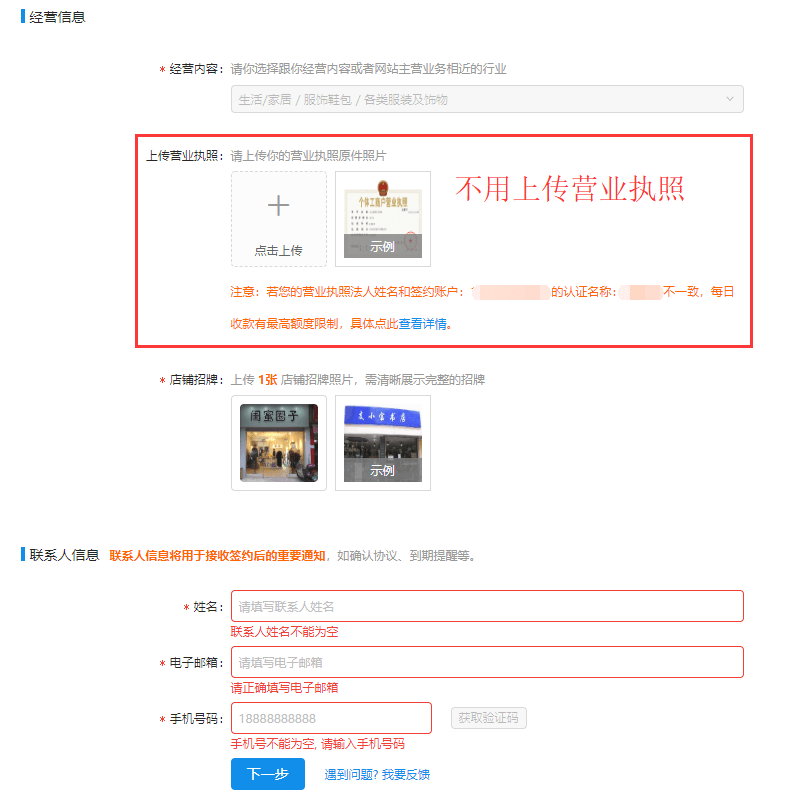 2、填写资料,上传门店照片(可以线下找家店拍一个,也可以直接百度搜索“门面照片”、“门面超市”上传),不用要上传营业执照,下的联系方式需要如实填自己的;然后点下一步提交审核即可,费率最好填0.38%