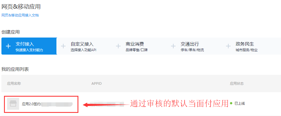 2、等待当面付审核通过后会自动生成一个开通当面付功能的原因,可以直接使用该应用的APPID和公钥对接你的网站,或者你也可以点击开发者中心–>网页&移动应用–>支付接入新建一个应用。